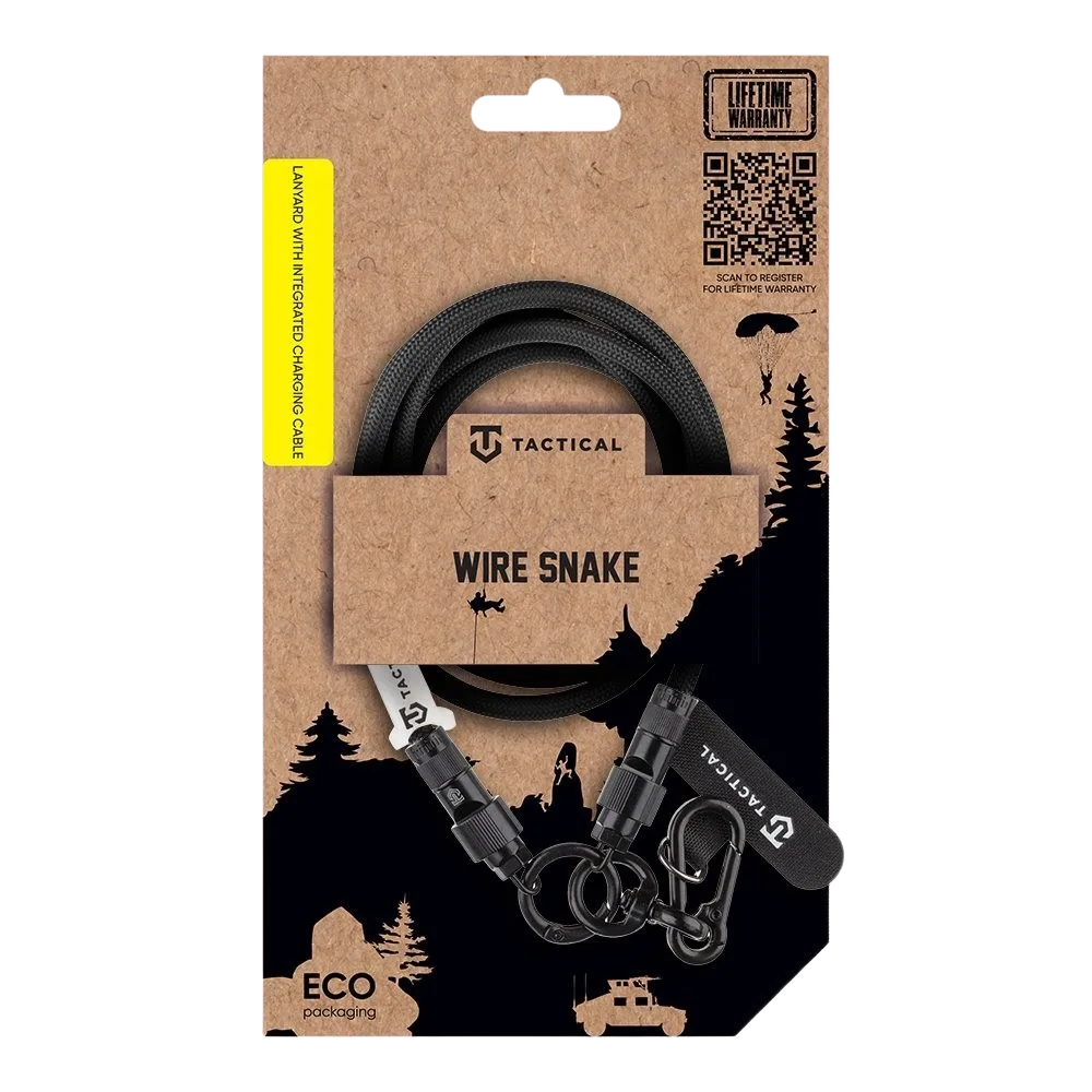 TACTICAL WIRE SNAKE Tactical Wire Snake spojuje odolný lanyard s plně funkčním USB-C / USB-C nabíjecím kabelem. Délka 1,2 m, výkon 60W (20V/3A) a kovové koncovky zaručují spolehlivé a rychlé nabíjení vašeho telefonu i další elektroniky – doma, venku i na cestách. NABÍJENÍ Nabitý na max – rychlé nabíjení 60 W (20V/3A), obrněné kovové koncovky a odolná konstrukce. Tohle lano udrží tvoje vybavení při životě, ať už tě mise zavede kamkoli. THE LANYARD Otočná karabina? Jasně. Systém na uchycení telefonu? Připraven. Silikonové poutko na klíče, nástroje nebo cokoliv, co taháš s sebou? Vždycky ready. Hoď si ho na krk, připni na batoh nebo ke své výstroji – tohle je gear narozený do terénu. NEODOLATELNĚ ODOLNÝ U nás v Tactical dbáme na to, aby věci něco vydržely. Proto tento kabel v dané kategorii nabízí jen to nejlepší. Při výrobě jsme použili velice odolné materiály a aplikovali nejnovější technologie pro co nejlepší výstup. I proto se na tento kryt vztahuje program doživotní záruky.* Viz podmínky programu doživotní záruky Tactical. BE ECO My v Tactical máme rádi přírodu. Všechny naše produkty jsou balené do ECO krabiček z recyklovaného papíru tak, aby co nejméně zatěžovaly životní prostředí. Mysli takticky!